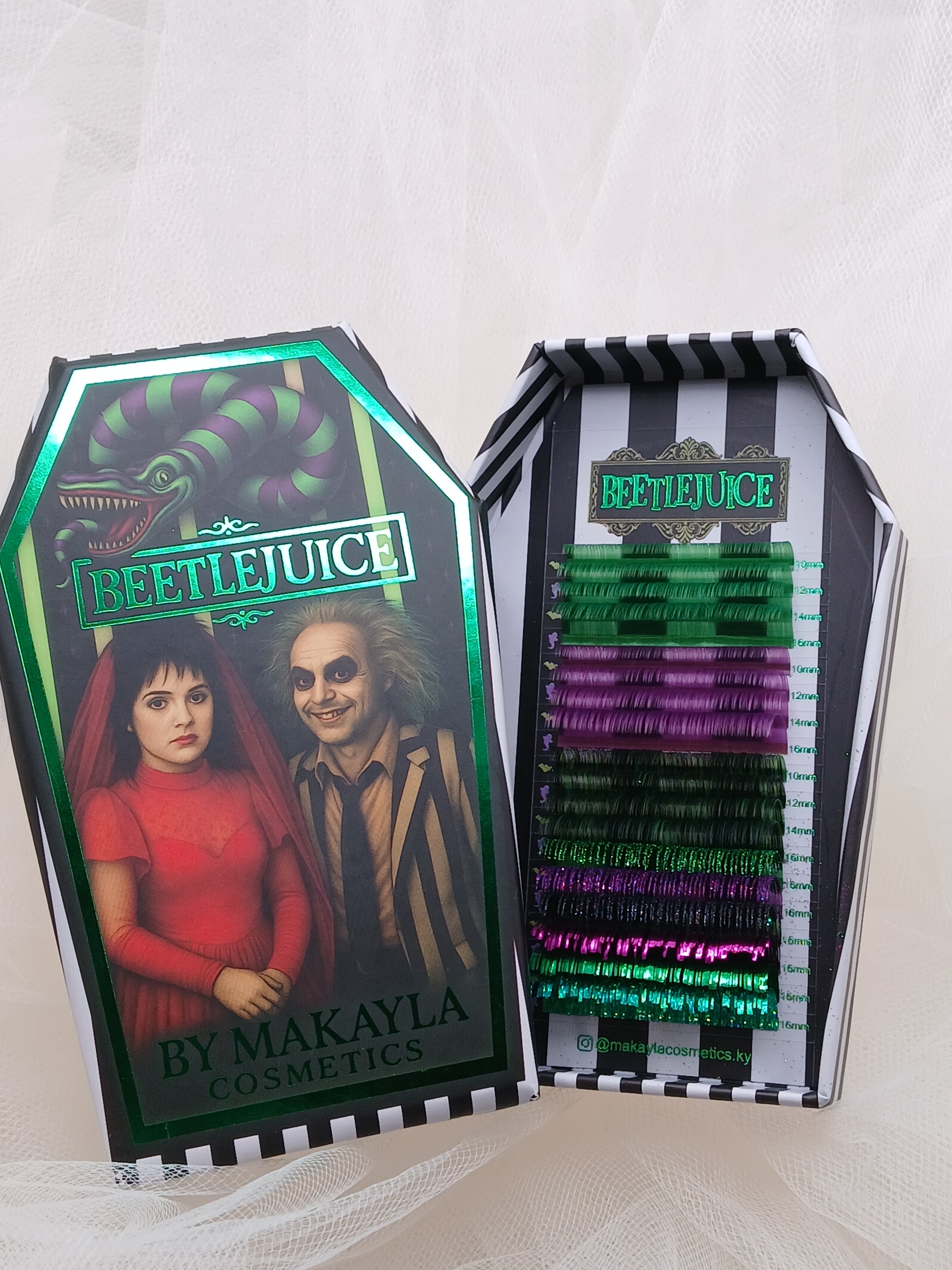 Step into the spooky luxe with our Beetlejuice-Inspired Coffin Lash Trays. Designed with striking detail, each tray features coffin-shaped packaging, glowing green accents, and custom Beetlejuice + Lydia artwork that makes this collection truly one-of-a-kind.