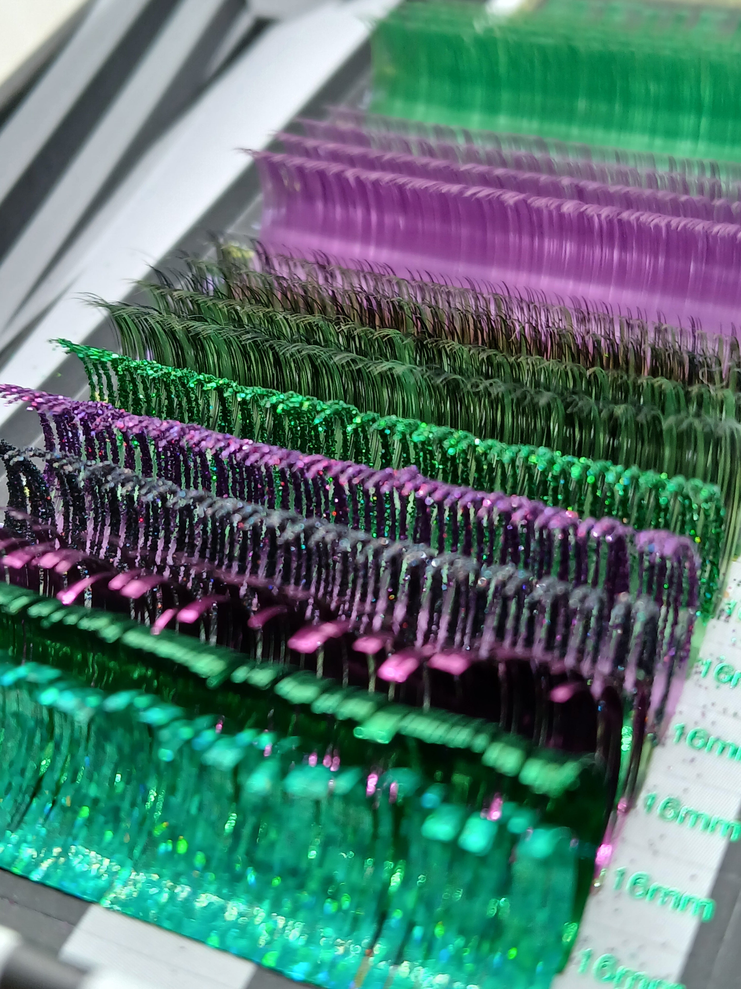 - A mix of vivid green, deep purple, green-black blend, and glitter lashes