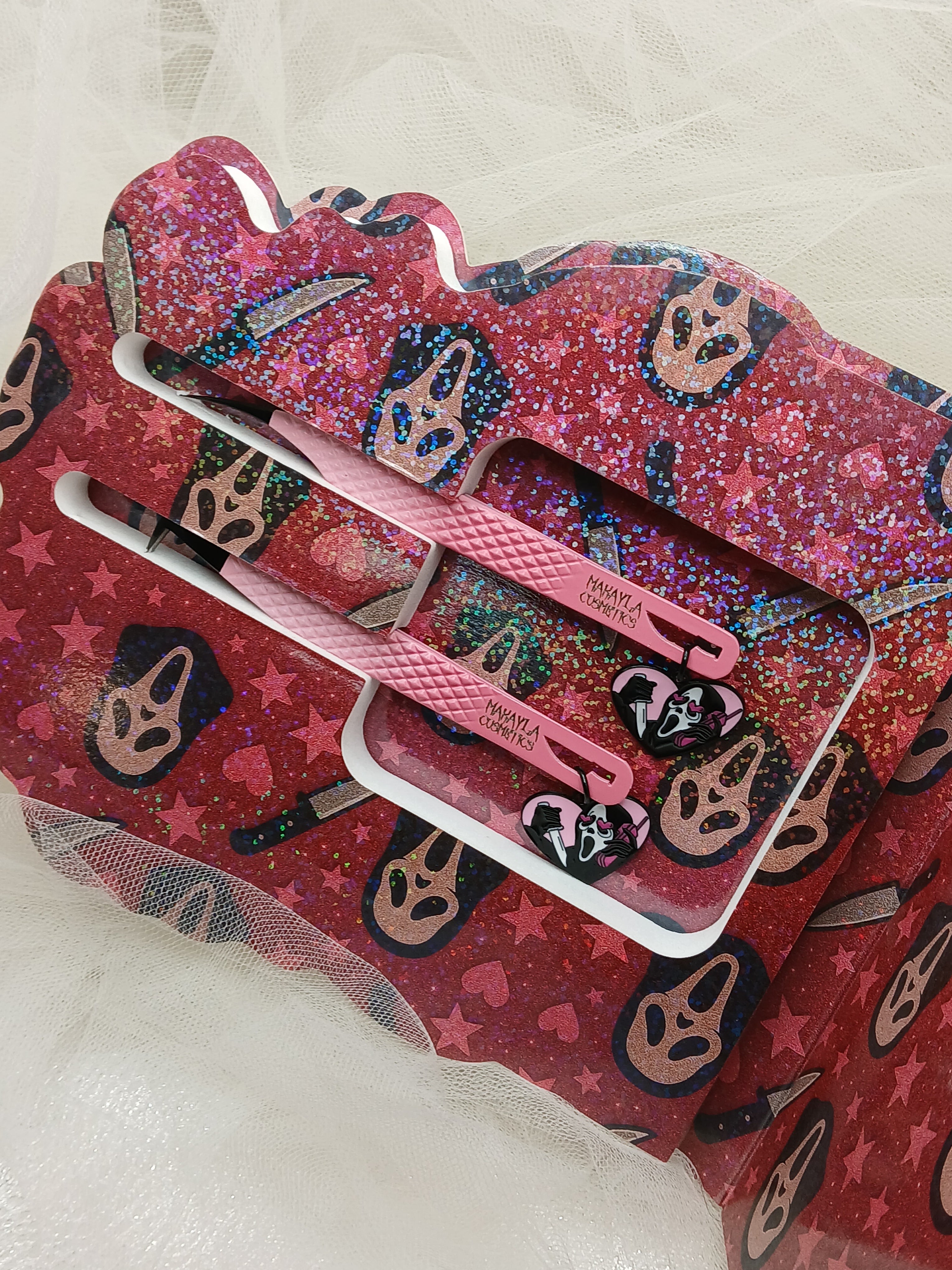 Cute, spooky, and deadly precise — our Ghost Face Inspired Duo Tweezers are here to slay this season. Featuring a hot pink to light pink ombré finish, knife cut-out design, and a playful “No, you hang up” Ghost Face charm, these tweezers bring the perfect mix of horror and glam.